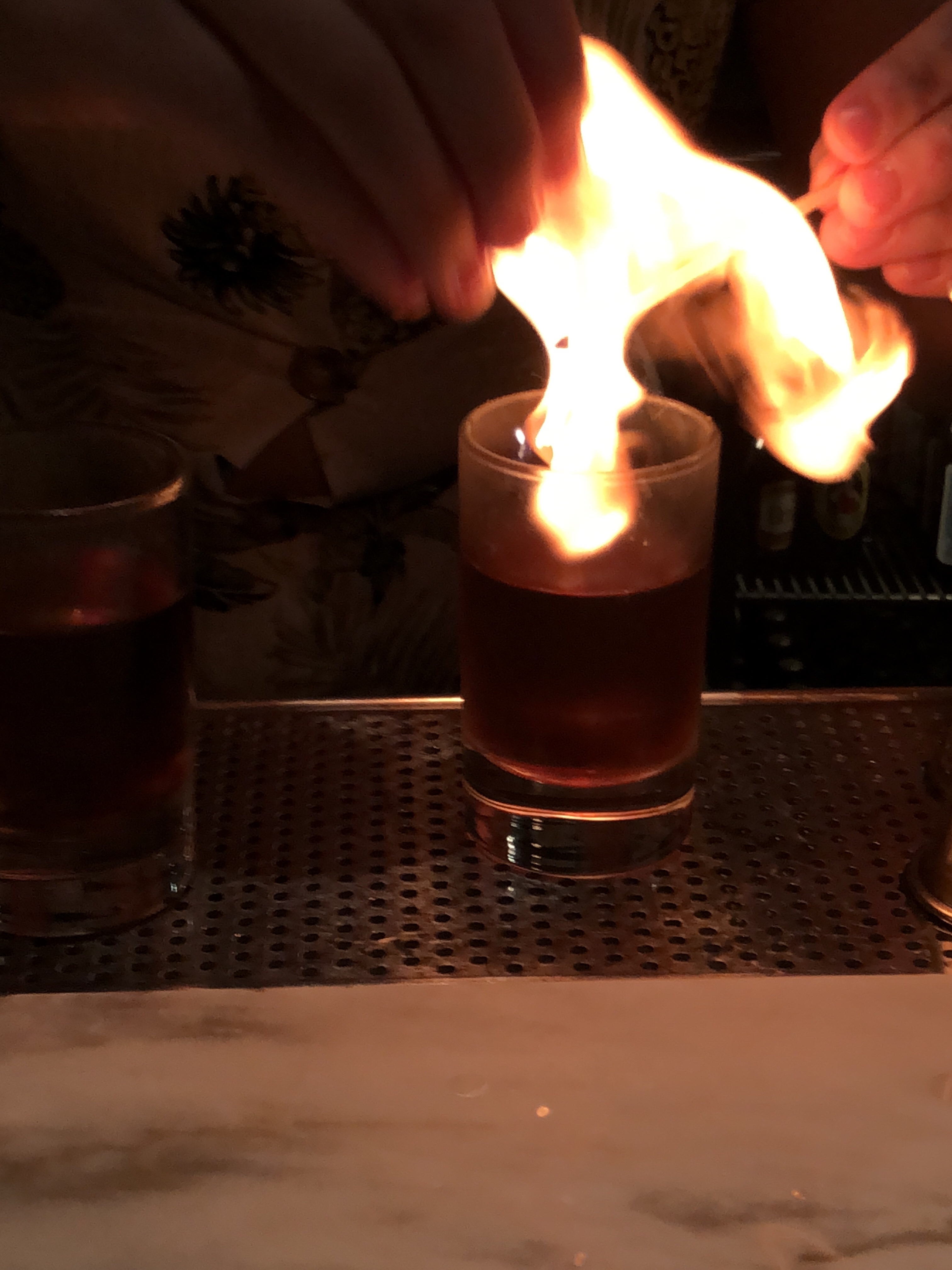 It was clear that we had to up our game if we were to be even a mild challenge to this bartender. Lorri went double or nothing, saying “This was great – you got anything else like this?”. Caitlin remembered from our previous order that Lorri mentioned that she liked Aperol but NOT Campari and produced a drink called the Spitfire (NOT related to the cognac Spitfire from Tony Congiliaro, who is NOT the beautifully tragic Tony Conigliaro of Red Sox lore). THIS Spitfire had mezcal and chili infused Aperol and could not have been MORE in Lorri’s wheelhouse (unless it was served by Channing Tate-yum on Ko Samui island with a Rosebank 21 chaser while Taylor Swift and a resurrected Prince serenaded her with a medley of Brandi Carlile tunes).