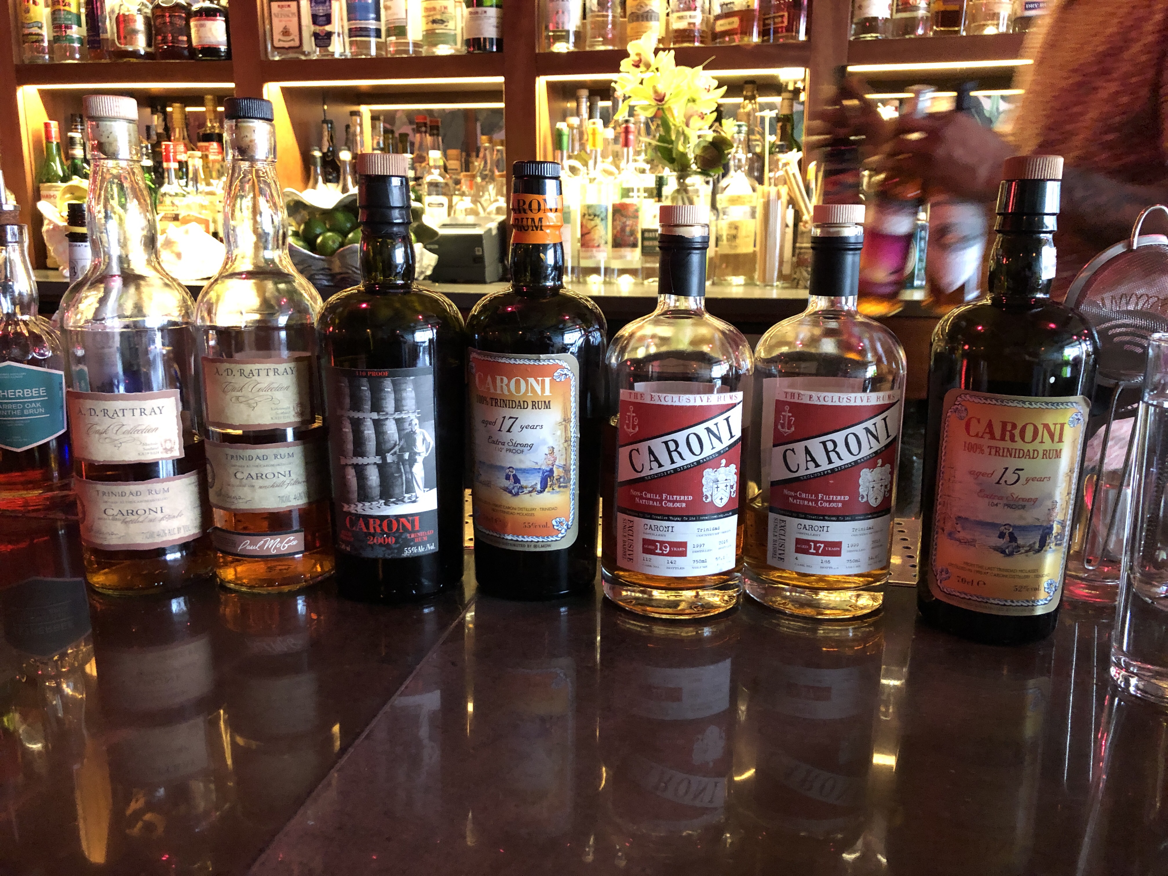 On the back bar we noticed a surprising number of THREE Caroni rums . The Caroni distillery from Trinidad closed in 2002, a real tragedy because it was probably the finest of its style, the “heavy rum”, full of richness and power and intensely long and developing finish.