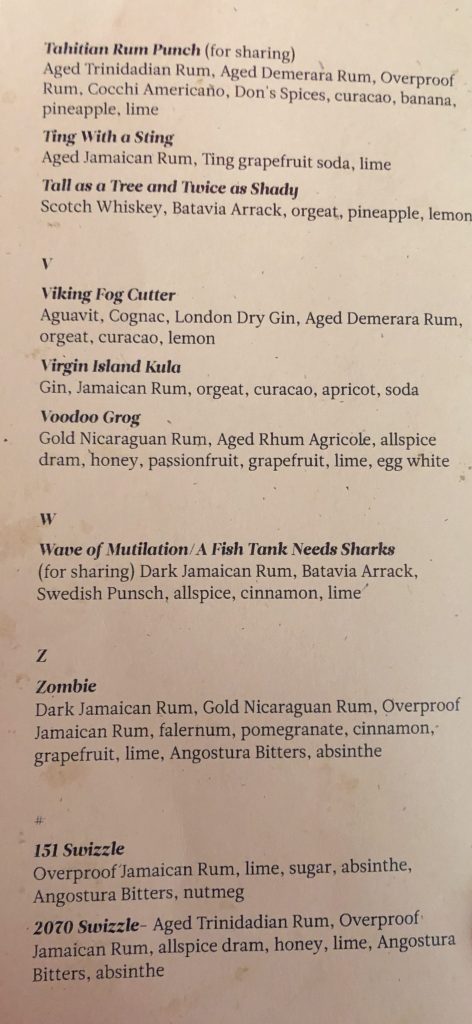 I didn’t need a menu for my first drink, though, having read about Paul McGee’s reinvention of the Fog Cutter, I’m a sucker for tiki drinks with atypical base spirits, so I’ve had several Fog Cutters with the usual rum, cognac and gin splits but I confess most of them end up becoming the Amorphously Pleasant But Generically Unfocused Tiki Cocktail.