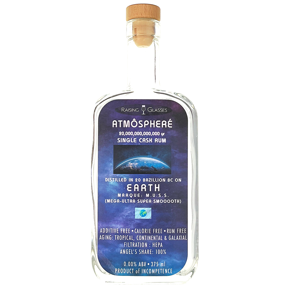 ATMÔSPHERÉ (pronounced “at-MOSE-fur-AY ”) is a serendipitous masterpiece forged from a combination of artisanal negligence, Bonsucro™ certified pallet mismanagement, and a visionary lack of international cargo insurance. Originally intended to hold 7 yr Philippines rum, our cask fell 20 ft to the Earth – the rum perished … but our GREED survived, resulting in the bottle you now hold, you sucker.